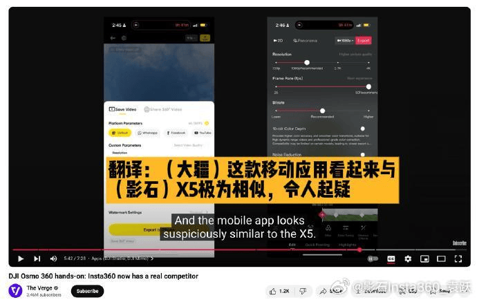 科技媒体反馈大疆app与影石十分相似影石中国区负责人袁跃也进一步补充,大疆推出的多款产品,大量“复制”了影石的创新功能与设计,并列出详细对比图佐证。这一说法也得到了不少用户和数码爱好者的印证:有用户表示,大疆Osmo 360的诸多功能设计与影石X5高度相似,APP界面交互甚至难以区分;资深数码爱好者称,大疆去年推出的全景相机、拇指相机,多项软硬件设计与影石现有产品极为雷同。
