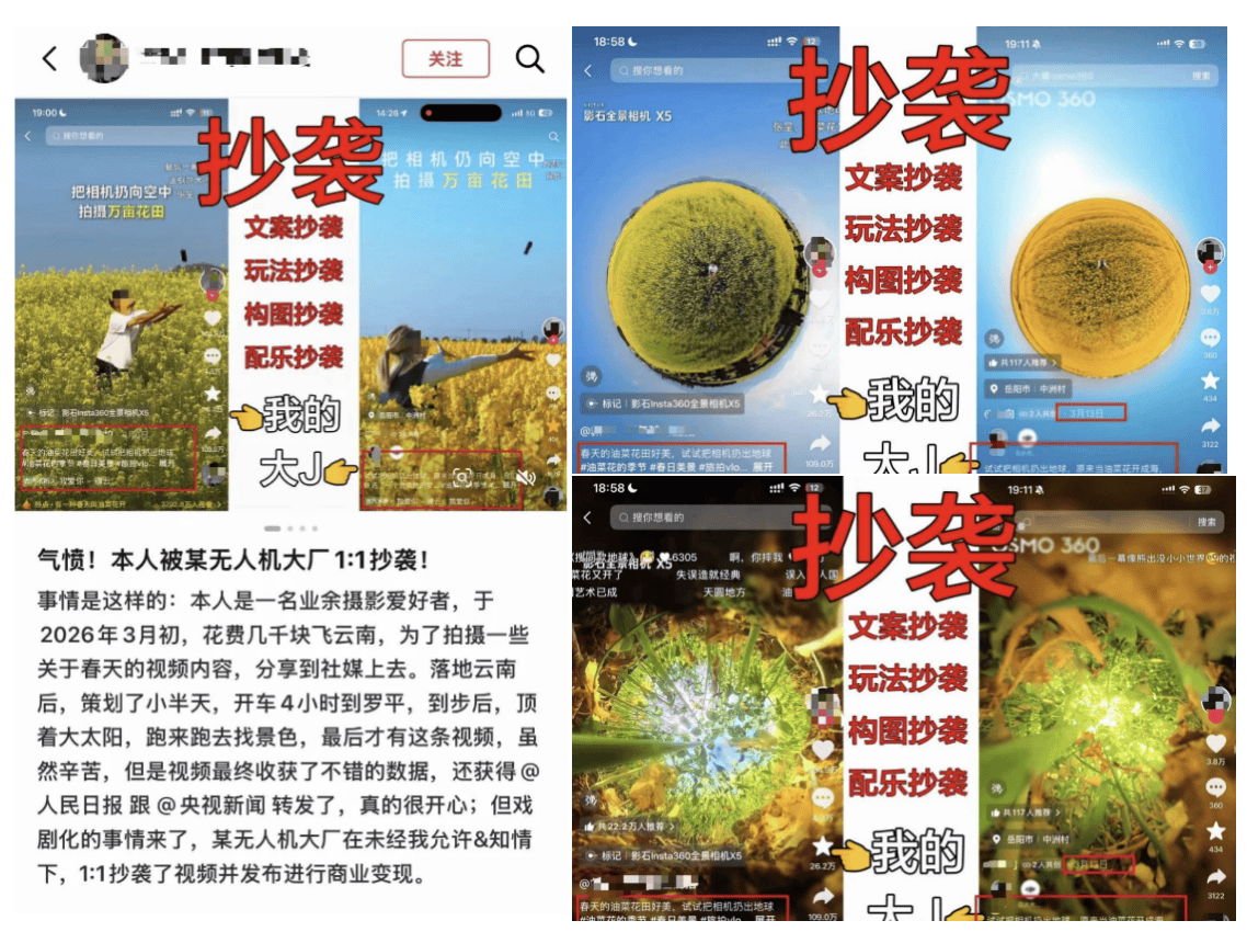 大疆app与影石app界面对比更具争议的是,有博主公开发帖,指控大疆官方宣传片“像素级1:1”抄袭其用影石全景相机拍摄的视频,且在未授权情况下用于商业用途,文案、玩法、构图、配乐完全一致。对此,有网友犀利点评:“大疆一边打官司说别人侵权,一边抄别人的视频,堪称回旋镖打自己。”