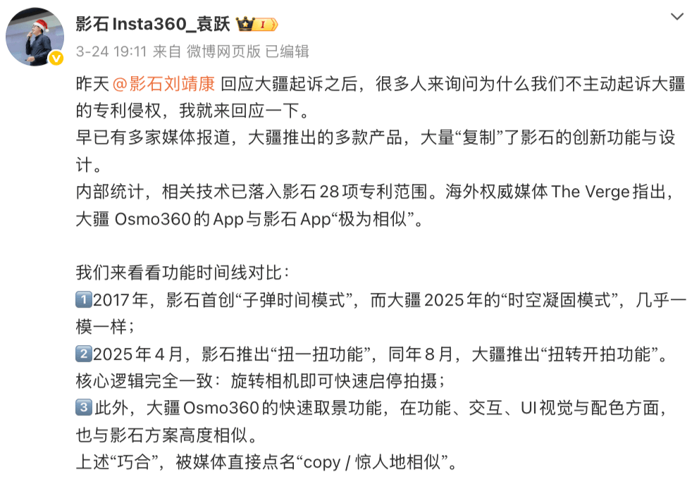 3 月 24 日,大疆与影石的专利纠纷持续发酵,相关专利附图相似等问题引发争议。影石方面随即作出强势回应,使得这场行业专利之争出现舆论反转,让这场专利战陷入反转疑云。