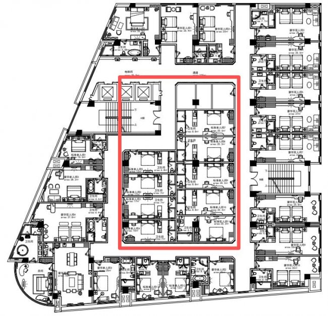 这家酒店原本有6300㎡,112间客房。蔡总他们对于空间布局,也有自己的想法,一半是普通的商务客房,专门接待周边会议中心的商务客群,另一半则做成主题客房,迎合年轻人的需求。