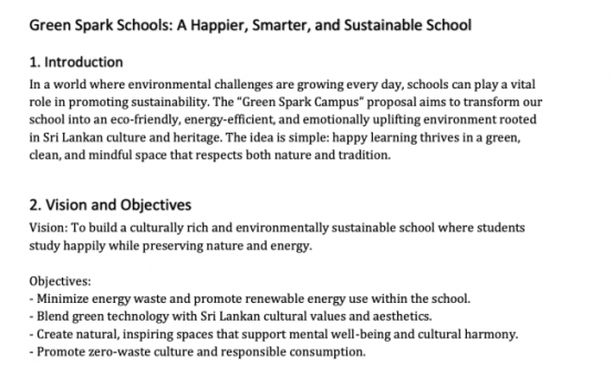 作品以校园为场景,将节能系统、零废弃午餐区、太阳能学习空间融入校园环境,并巧妙结合竹材、黏土、传统音调等斯里兰卡本土文化元素。设计兼顾环境效益与情感体验,兼具可实施性与教育意义,体现了青少年对可持续校园与社区文化的深刻思考。