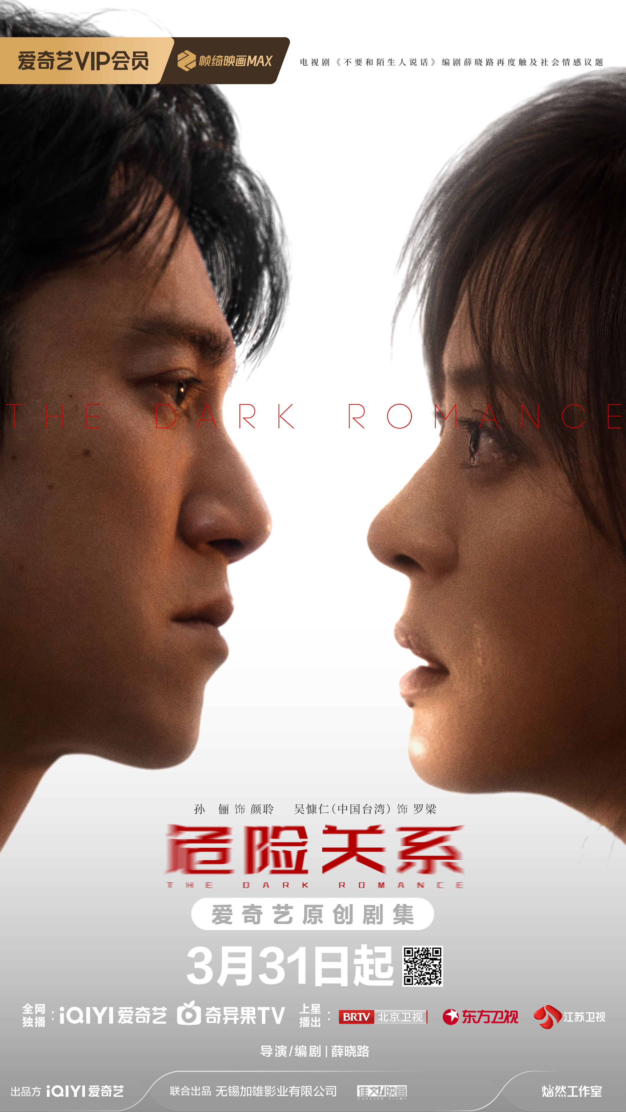 3月31日,国内首部聚焦情感操控(PUA)话题的原创剧集《危险关系》在爱奇艺全网独播,江苏卫视、北京卫视、东方卫视上星播出。《危险关系》由爱奇艺出品,锡加雄、佳文映画联合出品,爱奇艺灿然工作室打造。电视剧《不要和陌生人说话》编剧薛晓路再度触及社会情感议题,担任该剧导演及编剧,孙俪、吴慷仁(中国台湾)领衔主演。剧集讲述了单亲妈妈颜聆(孙俪 饰)逐渐陷入情感操控陷阱,历经挣扎与觉醒的故事。