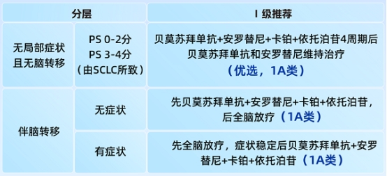 推荐意见:对于小细胞肺癌(SCLC)脑转移患者,一线治疗推荐贝莫苏拜单抗+安罗替尼+依托泊苷+卡铂(2A类推荐)。