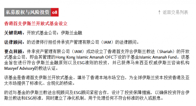 传承资产管理有限公司凭借“香港首支伊斯兰开放式基金”,从数千项申报案例中脱颖而出,荣耀上榜,并被刊登于顶级法律商业期刊《商法》杂志上。