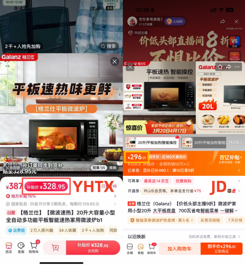 小家电品类同样存在这种情况。格兰仕家用小型20升微波炉,在JD下单补贴后到手价为296.01元,而在【与辉同行】直播间优惠后则需328.95元,两者相差32.94元。