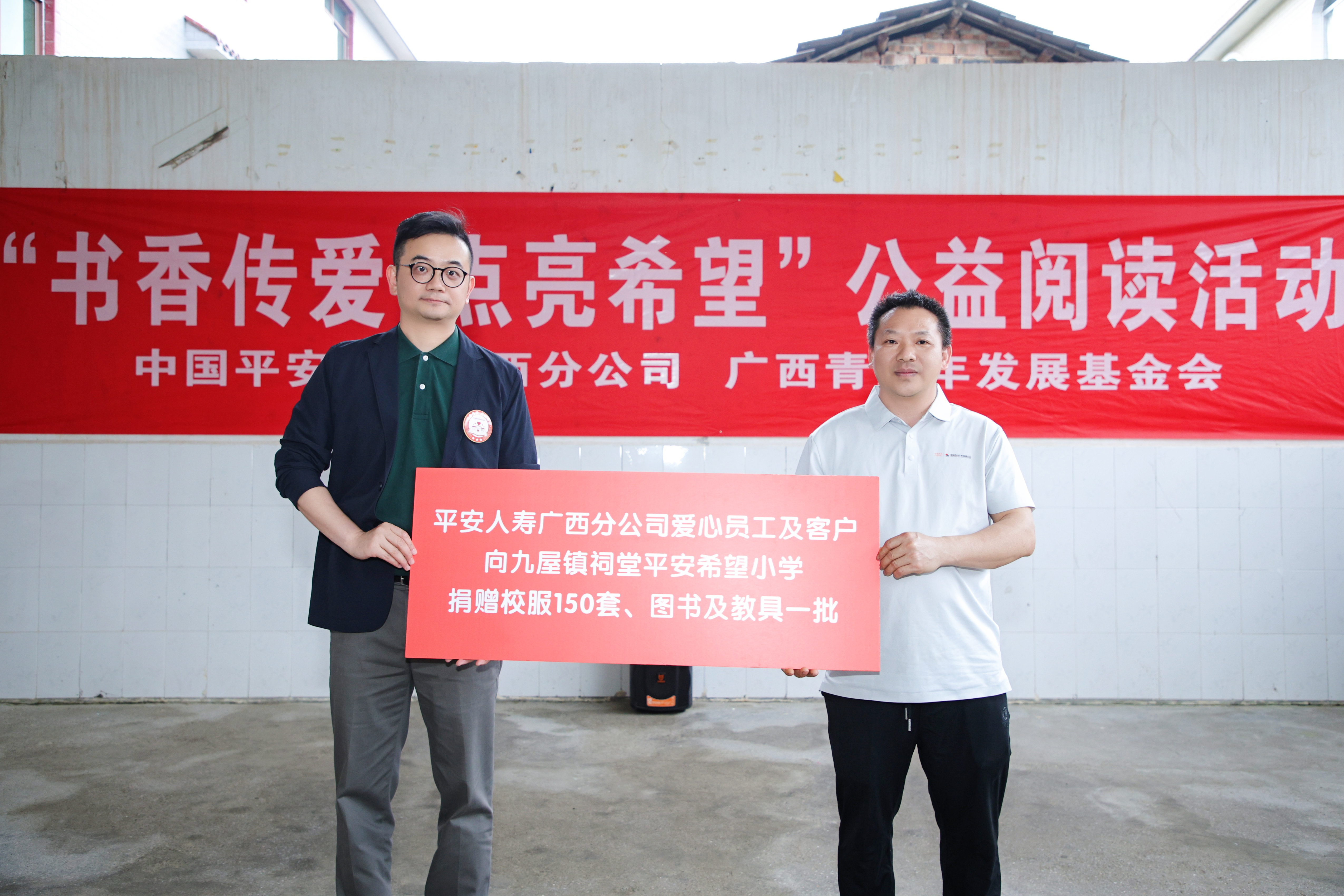 平安人寿广西分公司副总经理柯晓明(左)授予祠堂平安希望小学捐赠牌