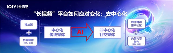 过去,以报纸、杂志、广播、电视、长视频网站等为代表的传统媒体,是由少数人决定广大观众的喜好来供给。但是当观众和作品众多的时候,少数人无法知道每一个观众的具体喜好,庞大的内容规模也不再是经济的投资,因此需要去中心化。长视频媒体未来要转型成创作者和用户社区,同时平台还做少量的头部内容。这是去中心化未来的结构,也指导着爱奇艺往这个方向发展。