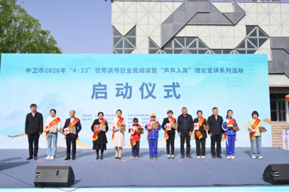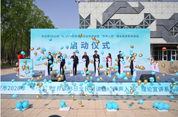 四月芳菲醉,书香染中卫。4月23日上午,中卫市图书馆广场上人潮涌动、文韵悠扬。由市委宣传部、市委统战部主办,市文化和旅游体育广电局等多家单位联合承办的中卫市2026年“4·23”世界读书日全民阅读暨“声声入耳”理论宣讲系列活动在这里启幕。本次活动以“深化全民阅读·共建书香中卫”为主题,旨在深入学习贯彻习近平文化思想,铸牢中华民族共同体意识,让爱读书、读好书、善读书的春风吹遍千家万户。
