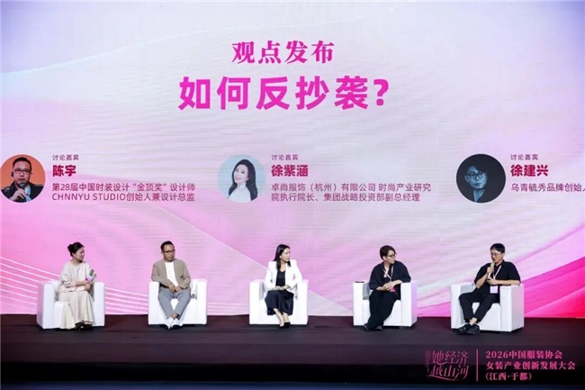 在《如何反抄袭》主题圆桌讨论环节,中国纺织工业联合会品牌办副主任王晴颖作为主持人,引导第28届中国时装设计“金顶奖”设计师、CHNNYU STUDIO创始人兼设计总监陈宇,卓尚服饰(杭州)有限公司时尚产业研究院执行院长、集团战略投资部副总经理徐紫涵,乌青毓秀品牌创始人徐建兴,STYLE3D AI项目专家赵杰诚,围绕设计师的现实困扰、AI时代如何建立规则、原创的版权保护等痛点展开了深度对话。王晴颖在主持分享中指出,原创设计不仅需要重视款式创新,还需要对品牌内在精神的打造。她认为,一个品牌只有建立起独立的世界观、生活观和审美观,才能真正形成不可替代的辨识度。