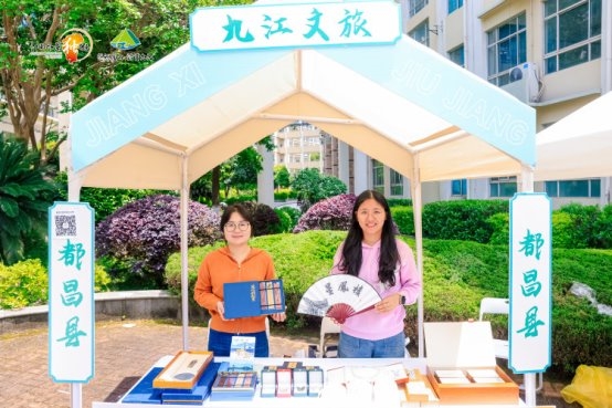 活动当天,武汉职业技术大学凌峰楼C11报告厅外的主干道上,一场充满浔城烟火气的文旅市集惊艳启幕。10个特色摊位整齐排布、错落有致,九江市及都昌、湖口、彭泽三县与八里湖新区,将九江的特色文旅资源、匠心文创好物与地道本土风味尽数呈现,以沉浸式场景全方位彰显九江文旅的独特韵味。