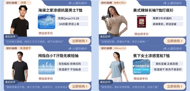 例如,标准中针对T恤中的重磅纯棉、吸湿速干、凉感降温等材质与功能,休闲鞋的回弹力、透汽性、轻量化等性能,防晒衣品类中近年来颇受消费者欢迎的原纱防晒材质,以及裤装中的莱赛尔等流行材质,内裤的抗菌、凉感等功能,均作出了详细的标准规范与分级,让消费者、品牌商家更直观、高效地进行选购与对比。