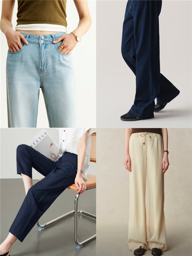 裤类中,森马夏季阔腿凉感牛仔裤,以棉天丝面料打造垂顺凉爽;Teenie Weenie小熊牛仔裤,甄选莱赛尔棉混纺面料,立体裁剪打造修长腿型;ELAND休闲裤,采用莱赛尔+亚麻搭配,实现轻薄触感与吸湿透气。逸阳镰刀裤,借助莱赛尔、亚麻与棉混纺,实现贴肤柔软,自带天然凉感不闷汗。